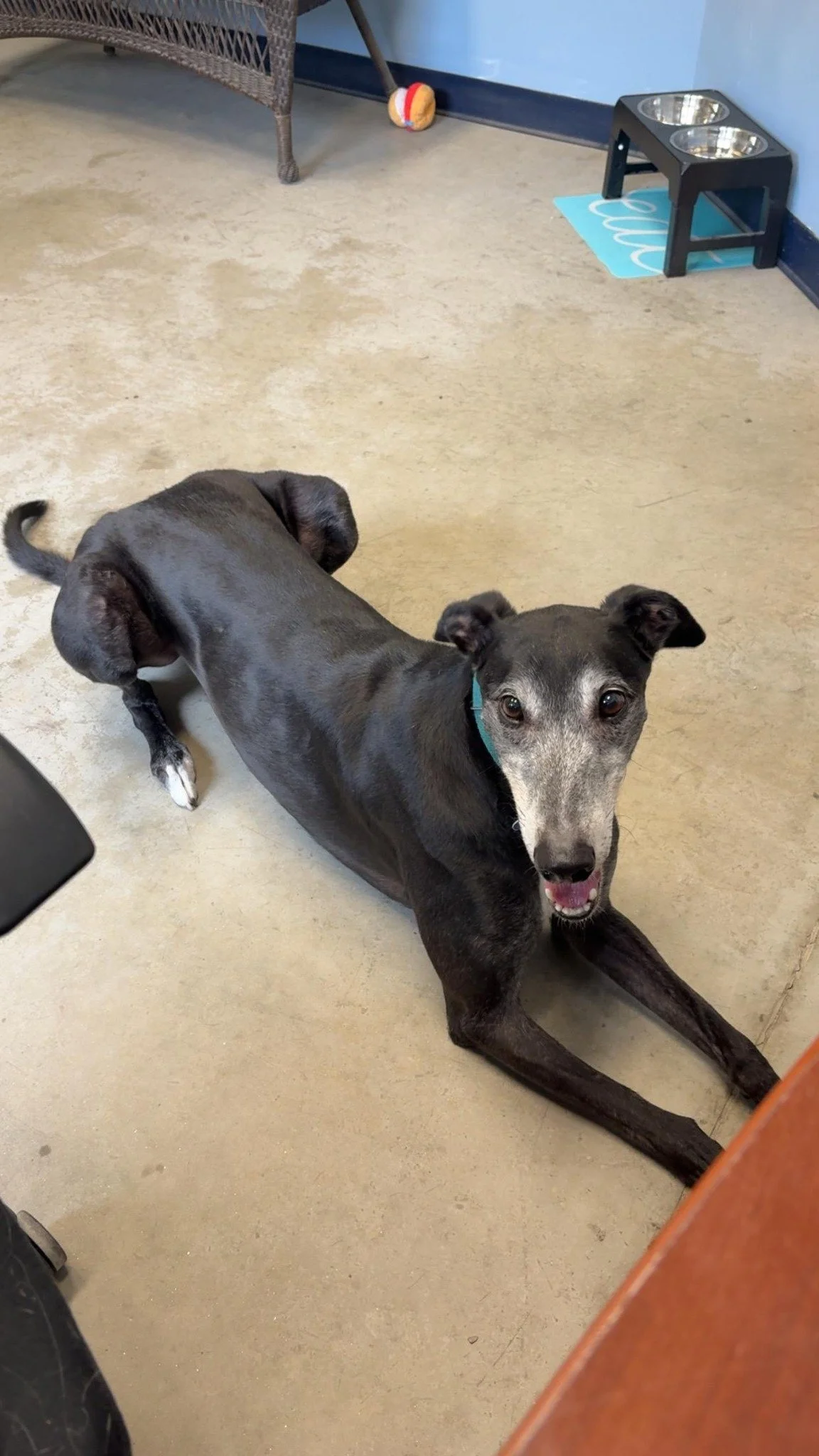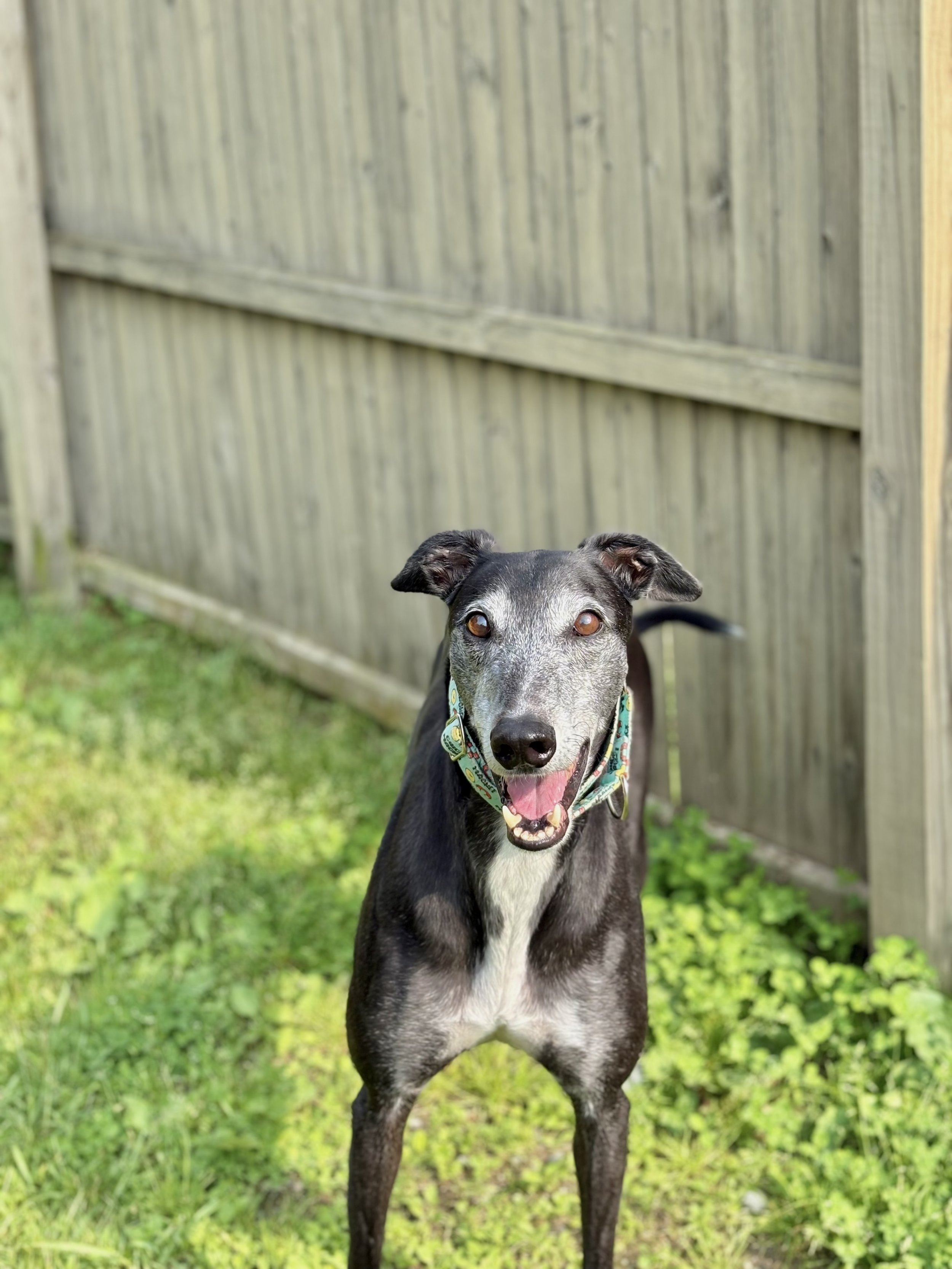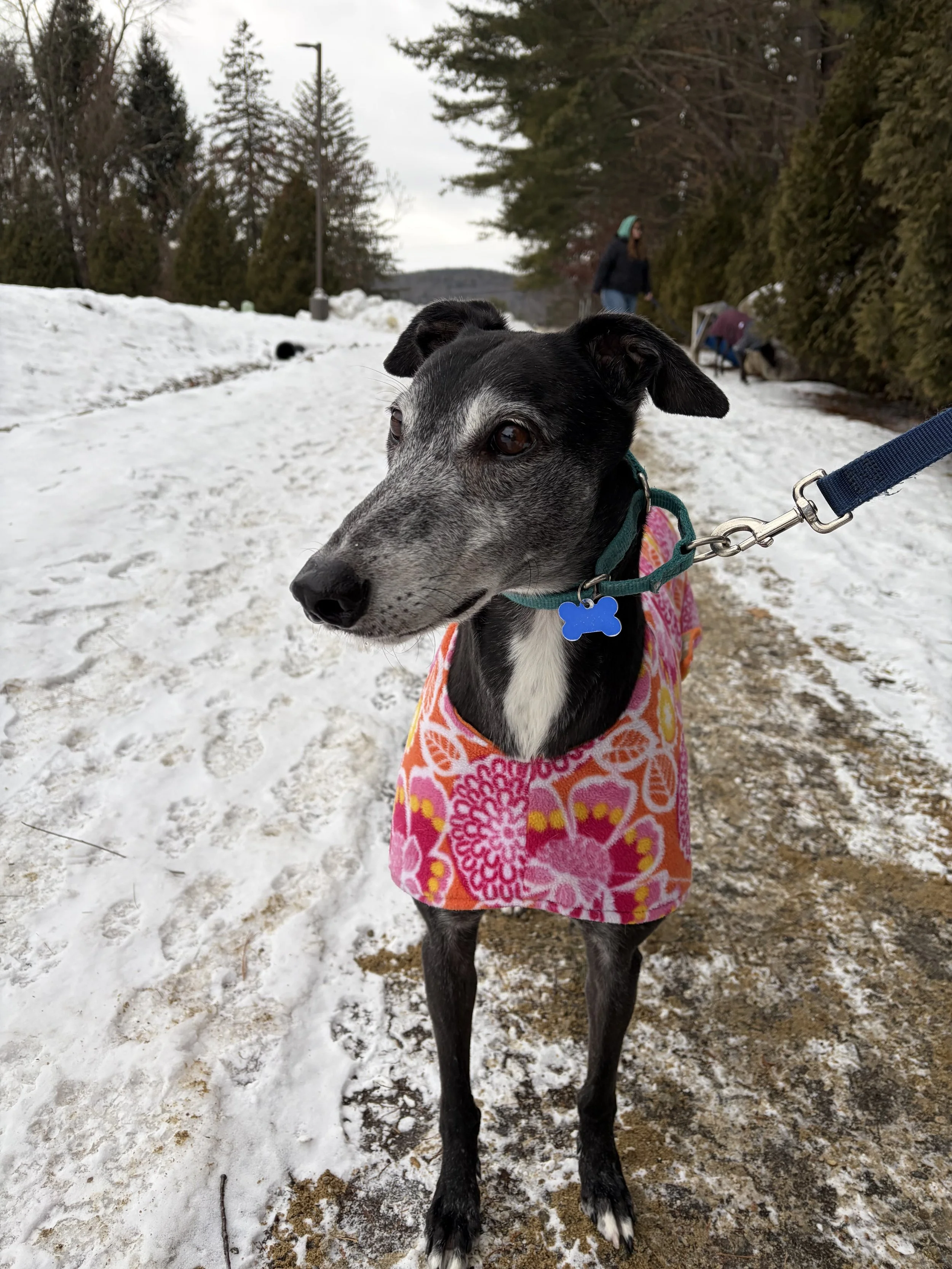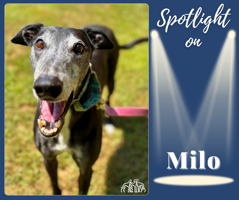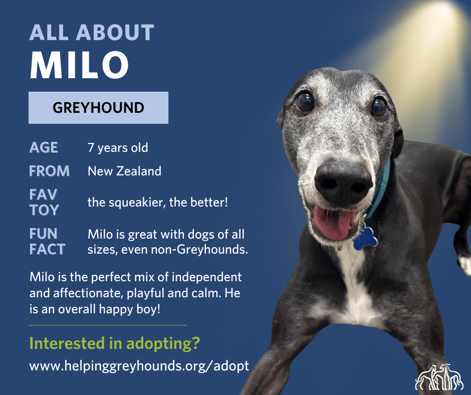 Meet Milo! He is retired racing greyhound from New Zealand. He is a happy, affectionate, and playful dog who is looking for a special home to call his own. He is both independent and people oriented. He has amazing leash manners and loves going on his daily walks to watch birds and squirrels. His three favorite things are: food, squeaky toys, and watching little animals run outside. He could watch little these animals outside for hours and never get bored. In the winter months he loves being bundled up in warm coats and modeling them on his walks outdoors. He also adores playing with his squeaky toys and doing the occasional zoomie. Milo has shown to do great with dogs of all sizes and enjoys making new friends.